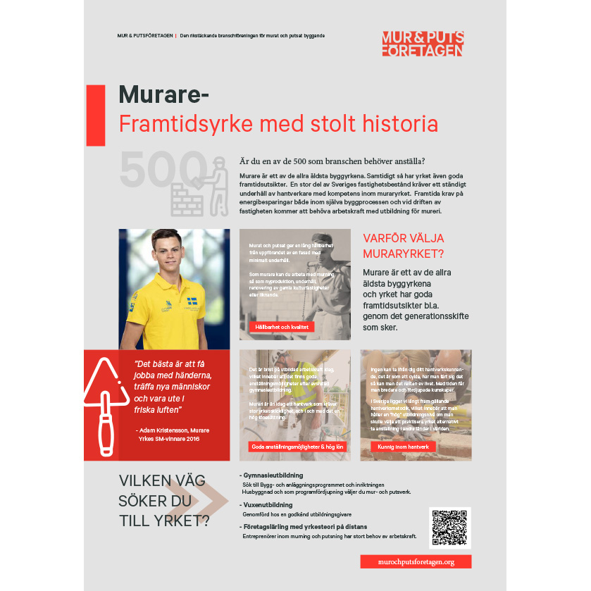 Murare är ett av de allra äldsta byggyrkena. Samtidigt så har yrket även goda framtidsutsikter. Byggteknik och material förändras, lagar och direktiv för byggnation utvecklas. En stor del av Sveriges fastighetsbestånd kräver ett ständigt underhåll av hantverkare med kompetens inom muraryrket. Framtida krav på energibesparingar både inom själva byggprocessen och vid driften av fastigheten kommer att behöva arbetskraft med utbildning för mureri.