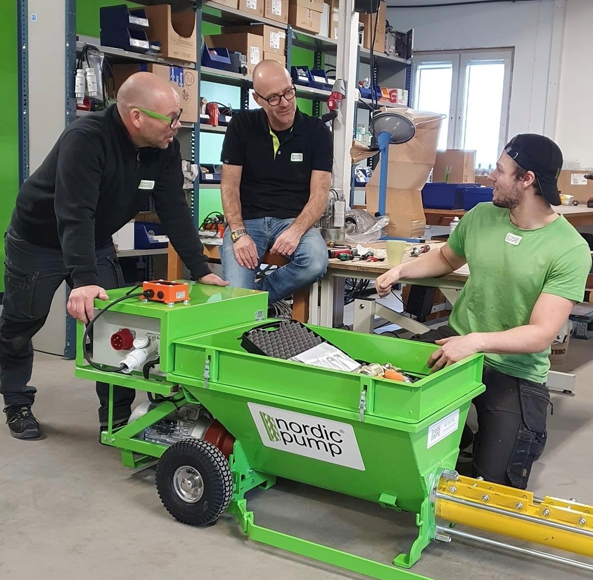 Nordic Pump – Svensktillverkade Brukspumpar, Bruksblandare och Blandarpumpar för byggindustrin. Sedan starten 2009 har Nordic Pump drivit utvecklingen av ergonomiska, lättanvända och effektiva brukspumpar och blandare. Grundaren Thomas ”Blomman” Blomström skapade den första modellen utifrån hantverkarens behov – enkel, lätt och effektiv. I dag fortsätter vi utveckla och tillverka maskiner med fokus på kvalitet, ergonomi, användarvänlighet och produktivitet. Hela vår verksamhet finns i Hedemora, vi är tre engagerade medarbetare som lägger stor vikt vid support, service och kvalité i vårt arbete. Användarvänlighet är ett ledord för oss och vi erbjuder självklart personlig support om man är osäker på något, stött på problem, eller har andra frågor kring våra maskiner och tillbehör. Våra maskiner är designade för hållbarhet under de tuffa förhållanden som ofta råder inom byggindustrin. Detta tillsammans med vår serviceverksamhet och våra stora resurser av reservdelar borgar för långa livslängder och låga livscykelkostnader såväl ekonomiskt som sett ur hållbarhetsperspektiv. Nordic Pump – Made in Hedemora, Sweden